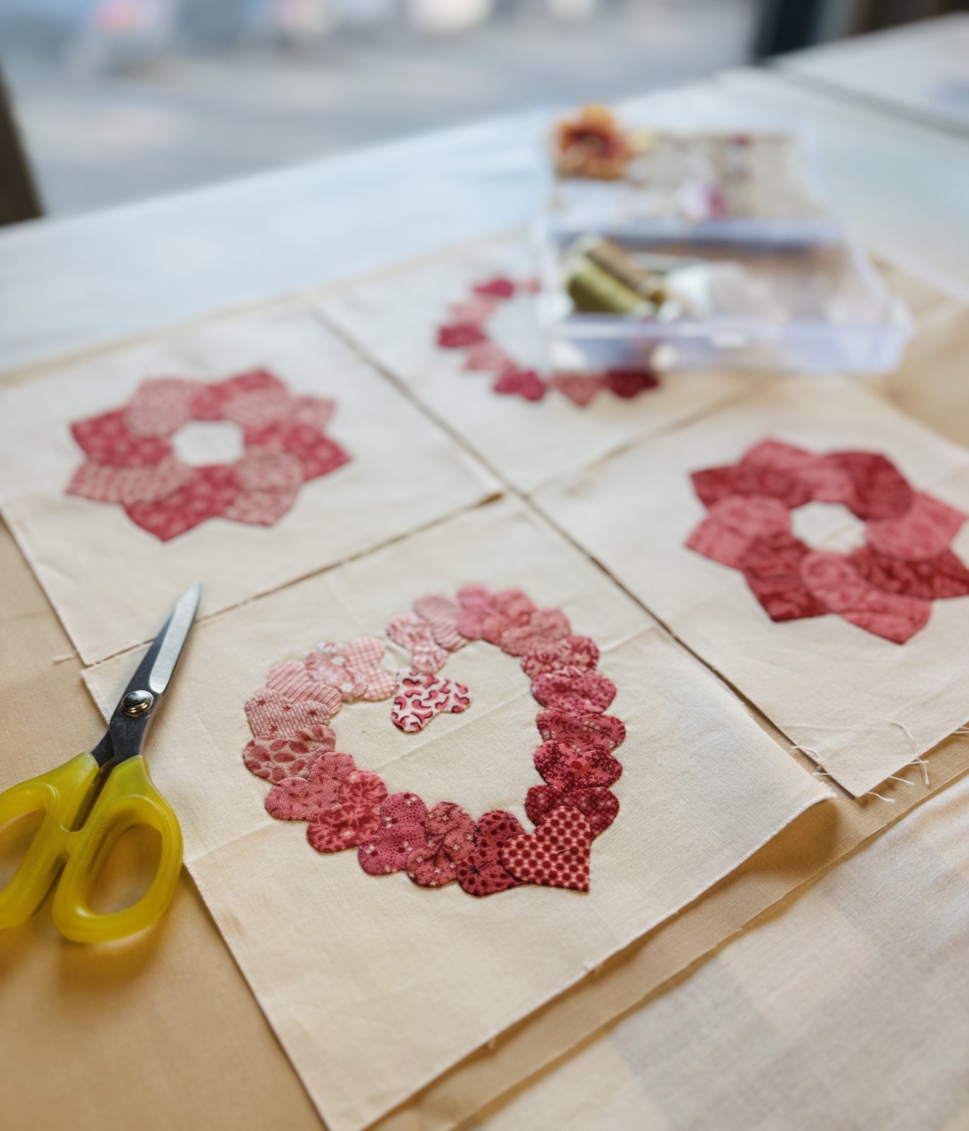 Whether you are new to appliqué (Beginners welcome!) or looking to refine and compare methods, this hands-on class offers foundational instruction and confidence building. Students will stitch a charming four-block heart design, perfect for finishing as a small wall quilt or table topper. The focus will be on accuracy, smooth curves, clean points, and confident handwork—skills that translate beautifully into any future appliqué project.