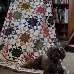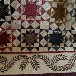 Celestial Garden is a richly layered quilt that celebrates the beauty of scrappy piecing and hand appliqué, inspired by 19th-century quilts and the maker’s love of working with many fabrics at once. This design is ideal for quilters who enjoy thoughtful fabric placement, gradual shading, and the slow pleasure of handwork.The quilt features striking star blocks surrounded by pieced units, framed with an elegant appliqué vine and leaf border. Corliss encourages working from the center outward, allowing the fabrics to transition naturally from dark to light—much like antique quilts where variety and balance were achieved through careful scrap use rather than strict matching.