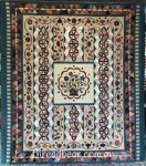 – Combines pieced panels with flowing floral appliqué