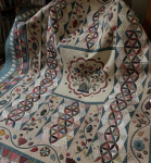 – Combines pieced panels with flowing floral appliqué